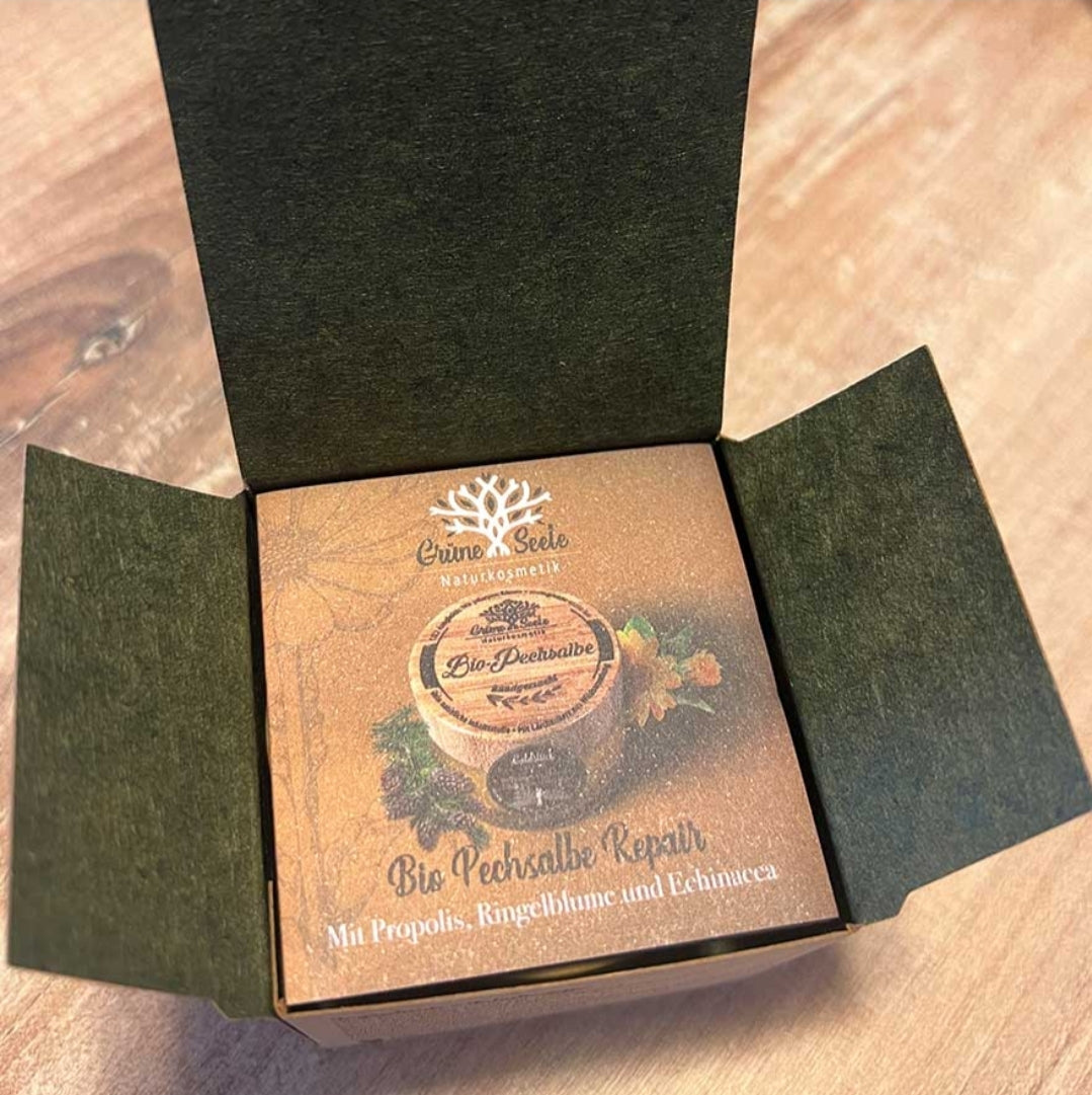 Allein die Recherche nach den besten Inhaltsstoffen für diese Pechsalbe hat "Grüne Seele" Wochen, wenn nicht Monate gedauert. Ein Lärchenharz aus Wildsammlung aus den Wäldern Österreichs, ein Bio Bienenwachs und Bio Propolis aus nachhaltiger Produktion mit Projekten zur Förderung von Wildbienen, sowie ein Bio Olivenöl von einer 40-jährigen Kooperative aus Griechenland. Zu allen Lieferanten pflegen wir einen persönlichen Kontakt. So könnt Ihr sicher sein, dass nur das Beste vom Besten in diese Salbe gelangt.